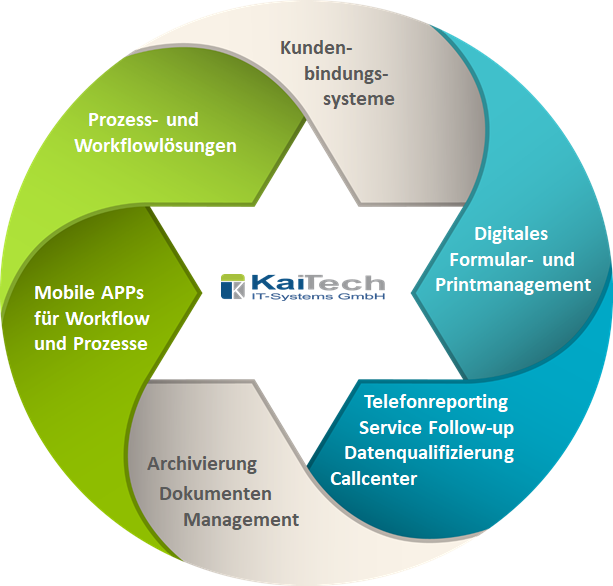 KaiTech ist IT-Dienstleister für das Autohaus und den Mittelstand. Die Kernkompetenzen liegen im Dokumentenmanagement, Archivierung, Prozessdigitalisierung und Individualprogrammierung. Hier zählen allein im Automobilbereich deutschlandweit über 600 Autohäuser verschiedener Marken zu den Kunden. Das Offerieren effektiver Lösungen für unsere Kunden in einem sich ständig ändernden IT-Umfeld steht für uns im Vordergrund.
